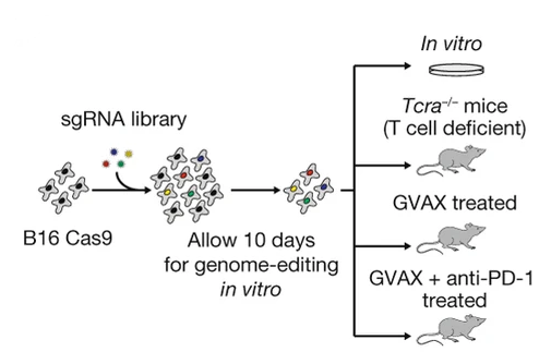 In recent years, in vivo CRISPR screens have become an excellent tool for the unbiased discovery of putative immunotherapy targets. The basic concept of such screens is that differing levels of immune pressure in mice xenograft models will selectively enrich or deplete specific genome edits which have been introduced through the transfection of a pool of CRISPR sgRNAs. This pool of guides constitutes a CRISPR screen library, a set of guides which will introduce the aforementioned edits into the cancer cell line to be engrafted. If the introduced edits are predicted to cause serious damage to the target genes, then the genes may be considered “knocked down” and the screen is called a CRISPRko screen. Alternative variations exist such as CRISPR “activation” (CRISPRa) screens, where transcription factors are pulled towards the promoter/transcription start site of the target genes, thus enhancing expression.